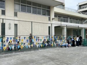前回も準備日が雨でしたので、ペナント張りを断念しました。ですから今年こそ、と思っていたのにまたもや断念?!・・・と、がっかりしかけましたが、作業の手順を入れ替えて、降りだす前に保護者のみなさんと先生とでがんばって結びつけて、本降り前になんとか木に結ぶことができました。