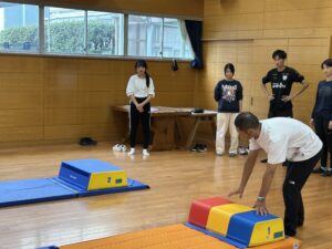 器械運動の学習を始めるのに先立って、先生たちは「ねこちゃん体操」の講習会を持ちました。