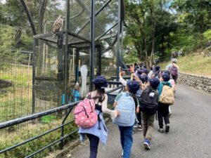 前半はみはらし広場に向かって、クラスごとでのぼりました。途中で、フクロウやワシ、コウノトリ、カンガルー、エミューなどに出会いました。子どもたちは目をきらきらさせて、動物を見ていました。コアラ館にも入って、うとうととユーカリの木で眠るコアラも見ました。