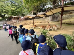 当日の朝、青空がのぞく遠足日和。集合時刻に全員で集まることが出来ました。実行委員が司会の『出発の会』を終えたら、いよいよ出発です。仙川駅から2回の乗り換えを経て、多摩動物公園に到着しました。