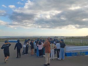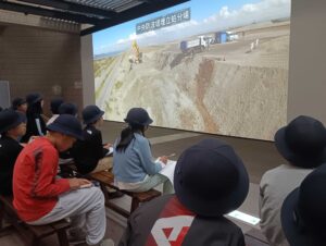 「中央防波堤埋立処分場」では、ごみを燃やした灰と土を重ねて埋め立てることでの環境への配慮、そしてこれまで埋め立てたところから出た有害水などを処理して、環境にこれ以上負荷をかけないこと、埋め立て地もこのままのペースだと50年ほどでなくなってしまうことなどを学び、最後は子どもたち全員で「こみをできるだけださない宣言」を海に向かって叫んで見学を終えました。