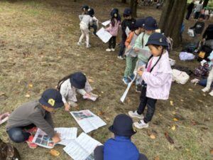 事前に木のはで学習していたこともあり、多種多様などんぐりや葉っぱを拾い集めながら、秋探しオリエンテーリングをどんどんクリアしていく子どもたち。無事に秋探しオリエンテーリングをクリアし、自由時間へ。