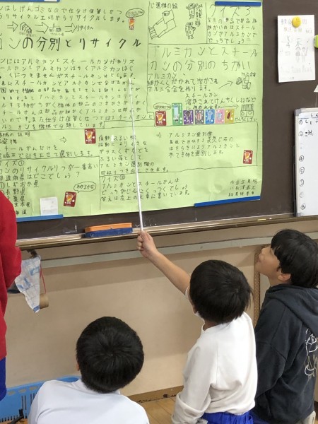 ごみの学習では、テーマごとにグループを作ってまとめ、3年生や保護者にも学んだことを伝える試みをします。いろんな種類のごみが発生していること、それらを分別して3R(4R)の取り組みでできるだけ減らす努力をしていること、ごみが増え続けていて処理が追いつかないこと、埋め立てる場所も無くなってきていること、地球の温暖化にもつながってきていることなどをまとめました。