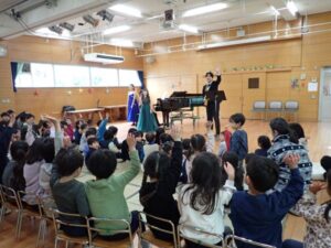 この2枚は幼稚園(左は演奏をしてくれた同じキャンパスの大学生。たのしい時間をありがとうございました。)