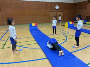 マットでは「ひざがピンと伸びているかな?」「技と技の間はスムーズかな?」など、鉄棒では「目線はどうする?」「鉄棒にかけている足、太ももからひざ裏に移動させるタイミングは?」などの視点を持ちながら、お互いにアドバイスをし合いました。できるようになった人、あと一歩でできそうな人、たくさんいました。