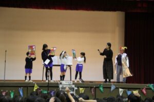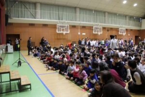 まずは体育館で、幼稚園から6年生までの全員が集まって、お祝いの集会です。