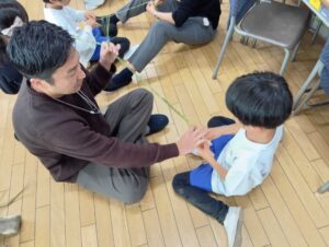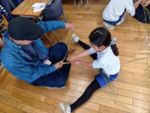 しめ縄づくりは、二人組になって行いました。一人ではむずかしい「ねじねじ」「ぎゅっぎゅっ」も、友だちと力を合わせることで、少しずつ形になっていきます。相手の動きを見ながら手を動かす姿からは、低学年なりの学びと成長が感じられました。