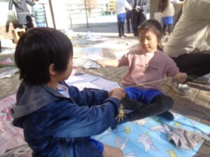 「しめ縄ってなんだろう?」「なんだかいいにおいがする!」と、わらを手にした子どもたちは、目を輝かせて活動を始めました。
