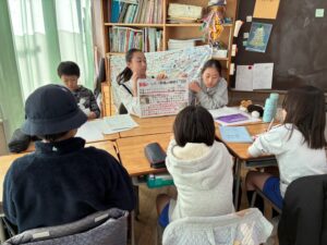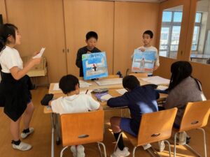今回の報告会では、6年生は3人1グループになり、それぞれで伝えたいことを紙のスライドにして、3人の5年生に伝えるという方式を取りました。20分間の報告ののち、対話の時間も設けられ、「あなたが考える平和とは?」などのテーマについて、自由に語り合いました。最後に5年生からの感想を聞いて報告会は終了。