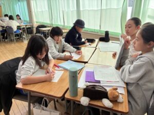 先日の半日研究会(年に数回、低中高学年それぞれにつき1クラスが午後残り、研究授業を行っています)では、この報告会が5年生に向けて行われました。