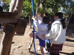 待っている人たちは、登りたい思いがあふれています【注2】。周りで見ている人もいます。自分の順番が来て、ロープにしがみついたものの、手と足の力で上ることができない人がいます。その人の背中やおしりを支える人もいます。しばらく粘ったけれども、登ることができないで、下に降りる人もいます。登ることが難しい時に、たすけて、手伝ってと言える、その声に応答する人がいる、そうしたやりとりを大切にしたいと思いました。時々、先生、抱っこ! 支えて~という人もいますが、自分や友だちに、ロープやまわりの木の助けを借りて登ろうと、励ましています。